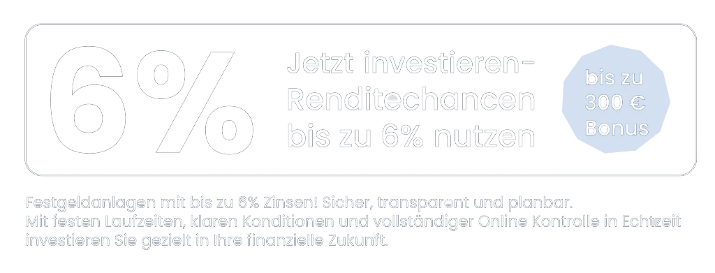 Sichern Sie sich jetzt attraktive Zinsen von bis zu 6% p. a. – eine unschlagbare Rendite für Ihre langfristigen Investitionen. Profitieren Sie von stabilen, garantierten Zinssätzen und einer sicheren Finanzplanung, die Ihnen eine sorgenfreie Zukunft ermöglicht.
